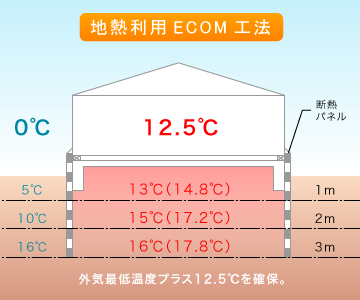 断熱材を用いて層を囲うことで循環を遮断させます。そうすることにより、暖かい地中熱が横に行かずに上昇するようになり、地上の建物の温度も上がります。結果として、外気の温度プラス10℃以上を確保できるようになるのです。